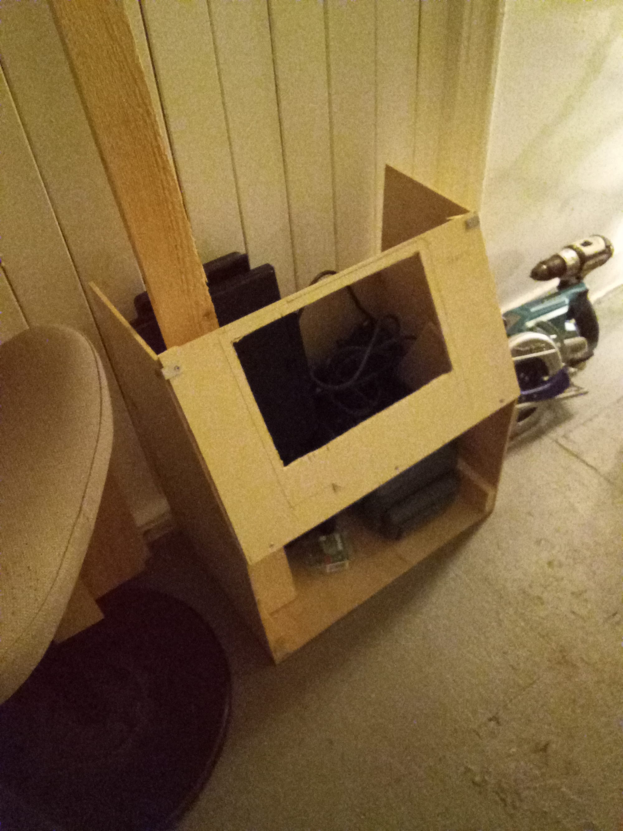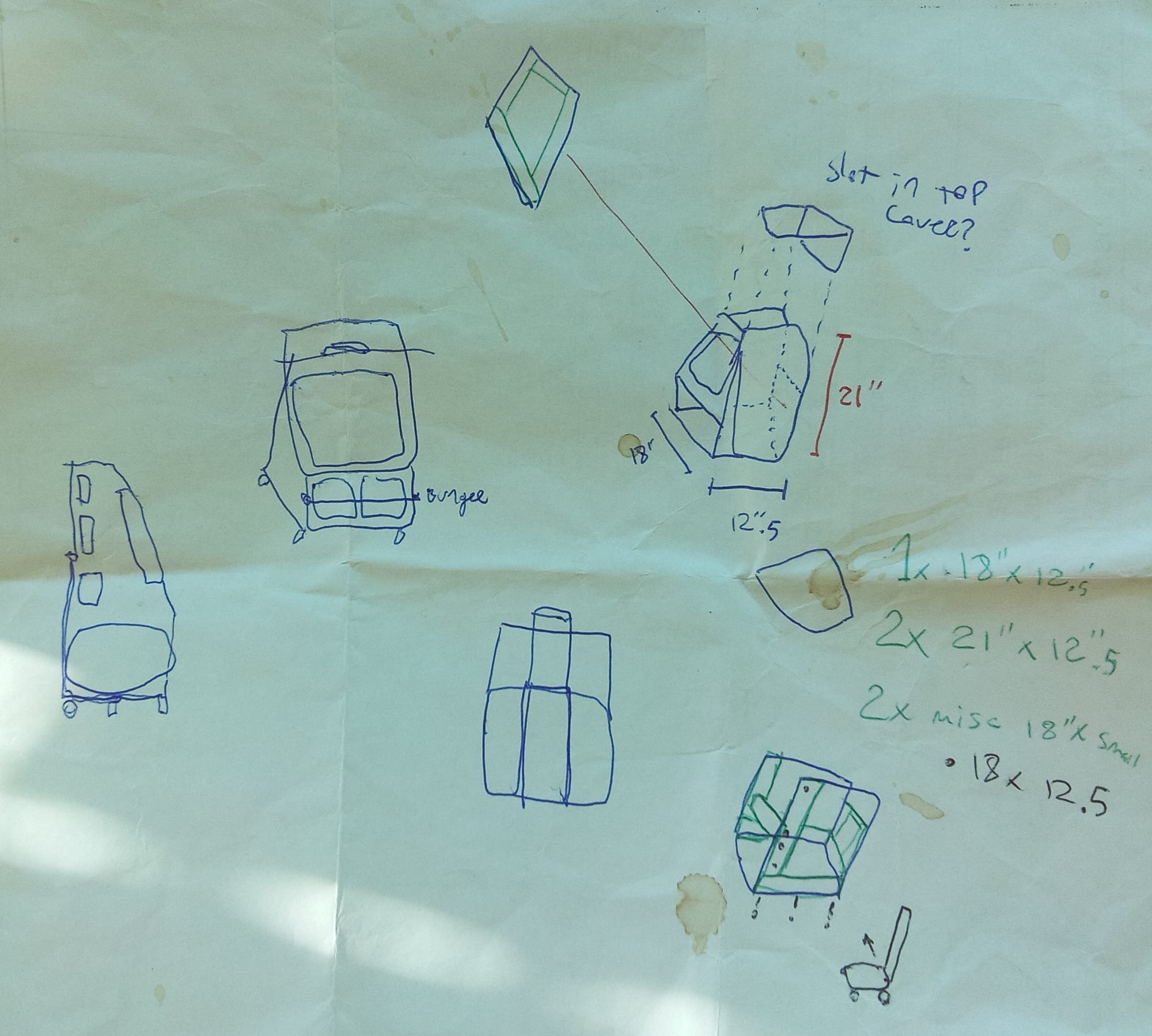 working with Luke on the enclosure. Wheels and handle are from a wheely backpack donated by Leslie