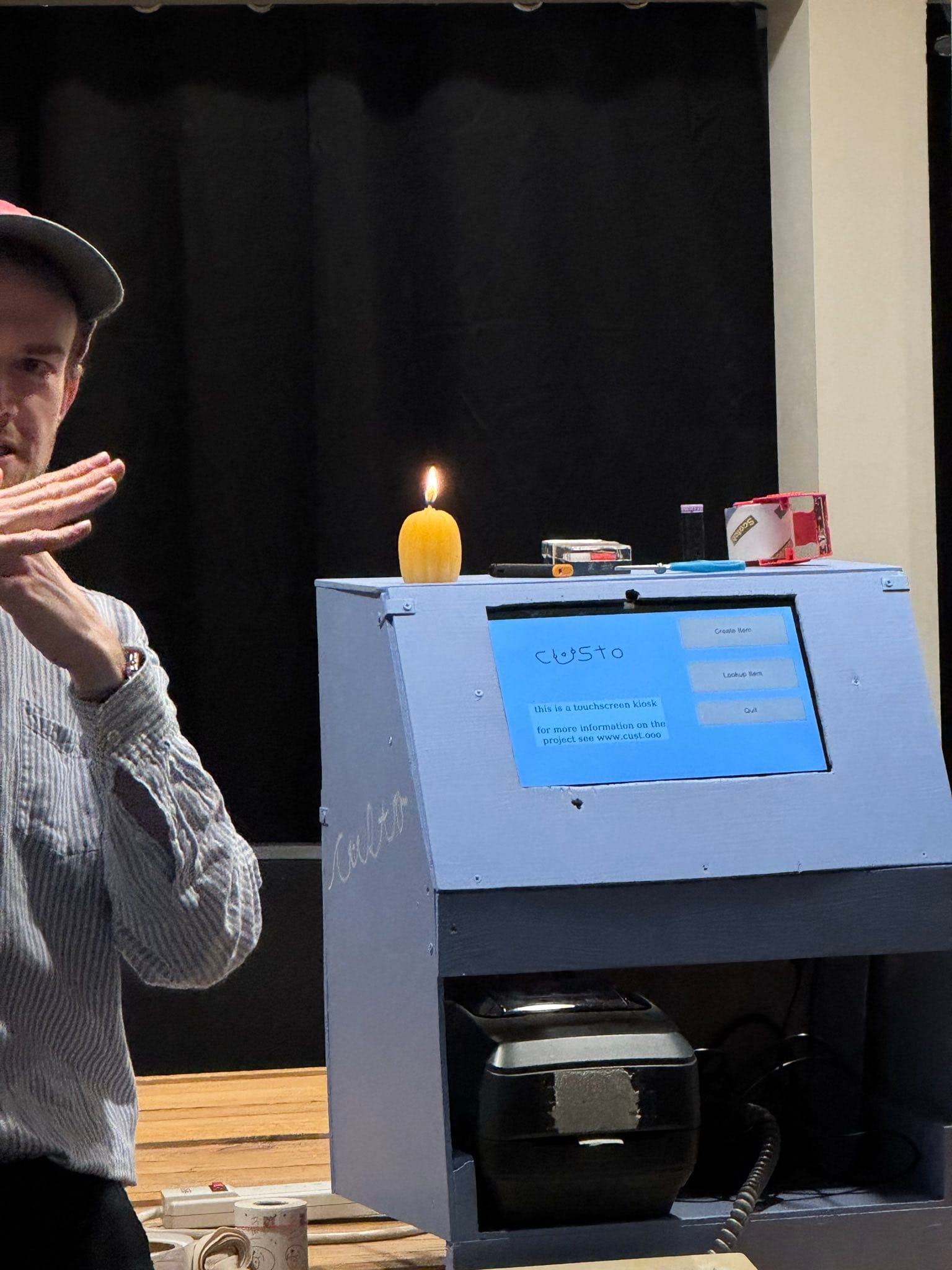 In December I was awarded a grant from Rhizome to build another kiosk of my Custo project. The kiosk allows people to immortalize an object by posting a photo and stories on the decentralized social network Scuttlebutt. You make a drawing on the touchscreen that gets printed out as either a sticker or nylon ribbon (like the tag in a shirt). Affix this tag to the item and people in the future can read about the history of the item and document their own history via the QR code. There's a lot more info on the project website